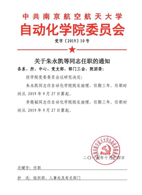 关于朱永凯等同志任职的通知