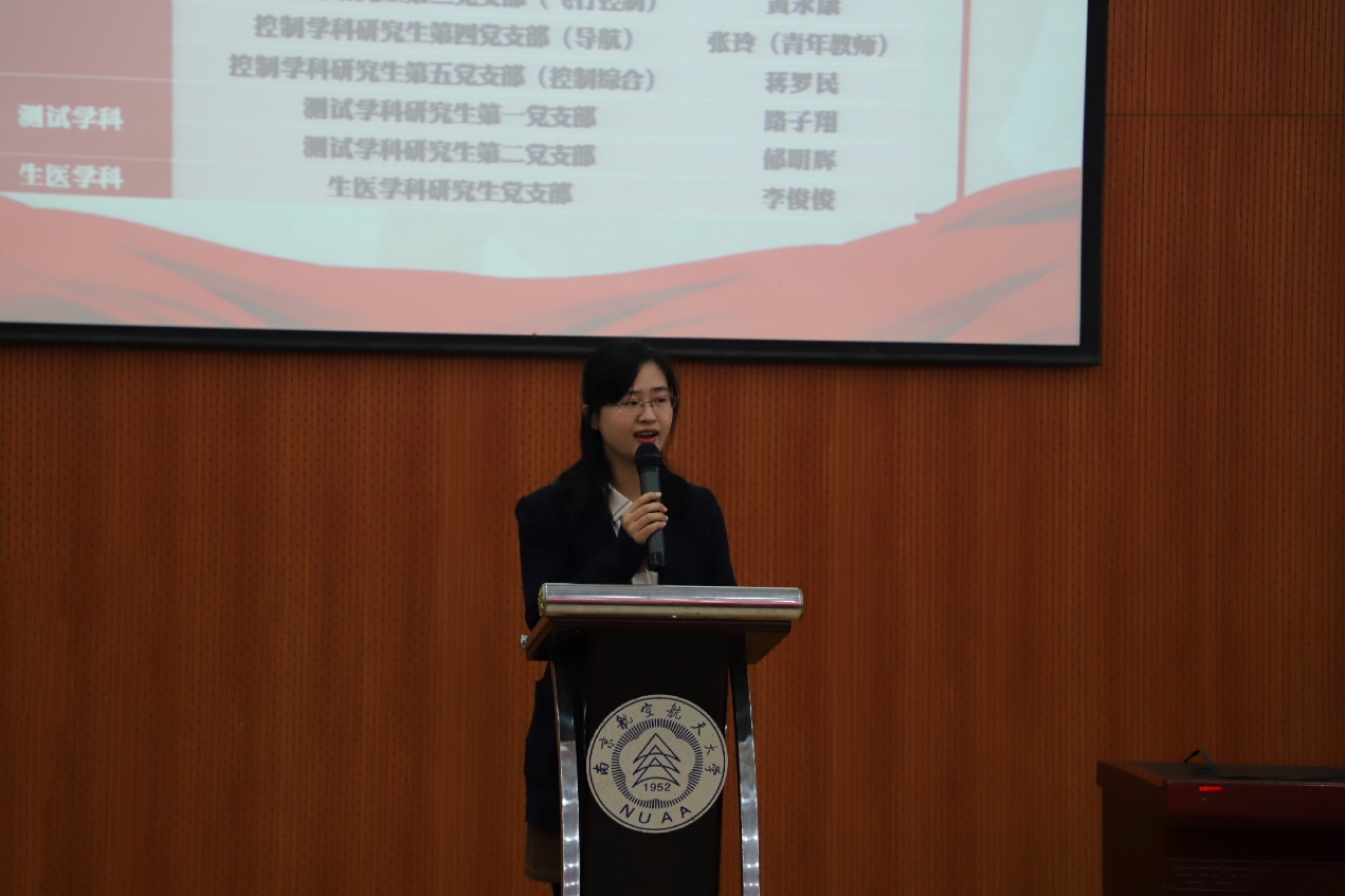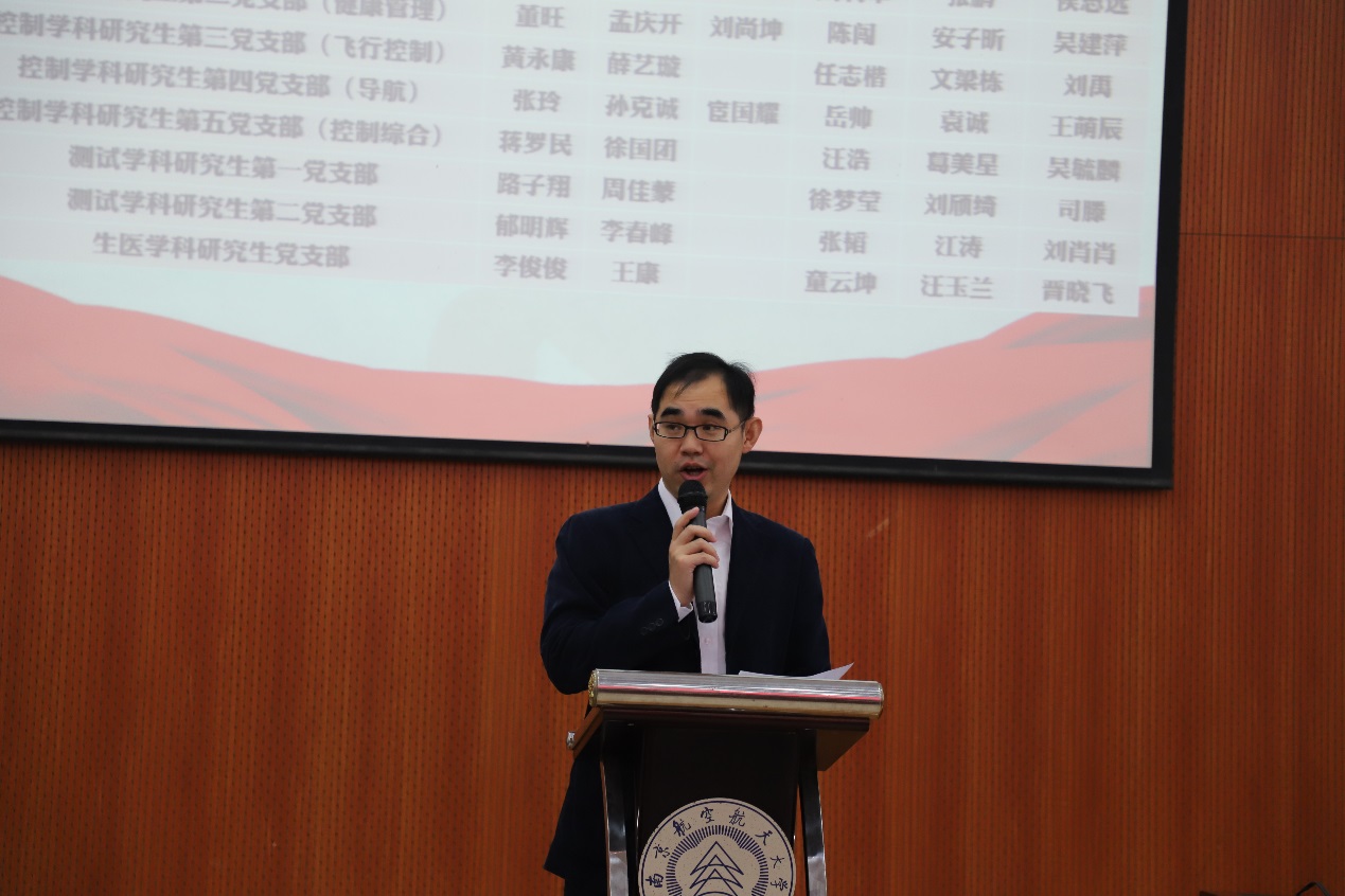 仪式开始,主持人刘斐文同志介绍了研究生纵向党支部成立的背景及具体安排。学院学生党总支在充分调研和征求意见的基础上,组织将原有建立在年级和班级的29个研究生党支部,按照学科、研究方向进行纵向化设置。经过党支部与党员的双向选择,新成立电气、控制、测试、生医四个学科下的14个纵向研究生党支部。