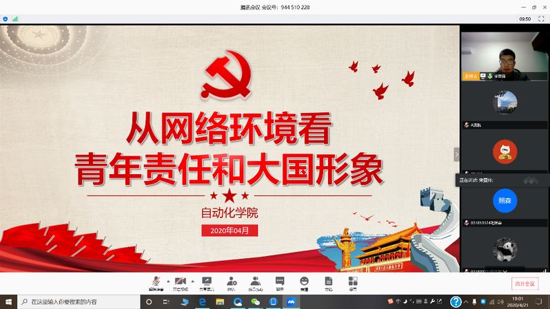 为贯彻中央《关于加强党的领导、为打赢疫情防控阻击战提供坚强政治保证的通知》和《新时代爱国主义教育实施纲要》精神,发挥学生党员先锋模范作用,认真学习新冠肺炎疫情防控“大课”,涵育新时代爱国主义精神、坚定爱国力行使命责任,4月21日,番号 本科2018、2019级联合党支部开展了一次线上“微党课”,从网络环境看青年责任和大国形象。