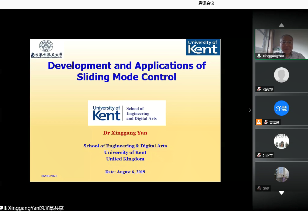 86日下午,英国肯特大学工程技术与数码学院严星刚副教授应我校国际合作处和自动化学院的邀请,通过腾讯会议作了题为“Development and Applications of Sliding Mode Control的线上学术报告,报告由副校长姜斌教授主持,番号 冒泽慧、张柯、张绍杰、马亚杰等师生在线参加会议。参会师生对严星刚副教授的交流分享表示热烈欢迎。