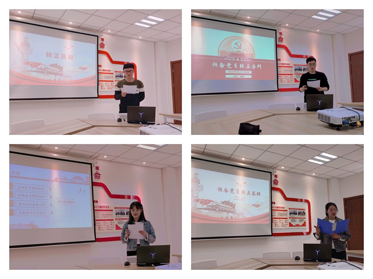 答辩会分为党的基础知识考核和预备期个人发展陈述两个方面。9名提交转正申请的预备党员在进行基本的党政知识考察后,开始了预备期的个人陈述。整场答辩会议进展顺利,9名提交转正申请的预备党员同志不仅较好的掌握了基本党政知识,在个人陈述中也表现出了预备期间全方面的积极发展。评审团老师们根据9名提交转正申请的预备党员同志的现场表现进行提问并指出不足,为他们以后的发展提出建议。