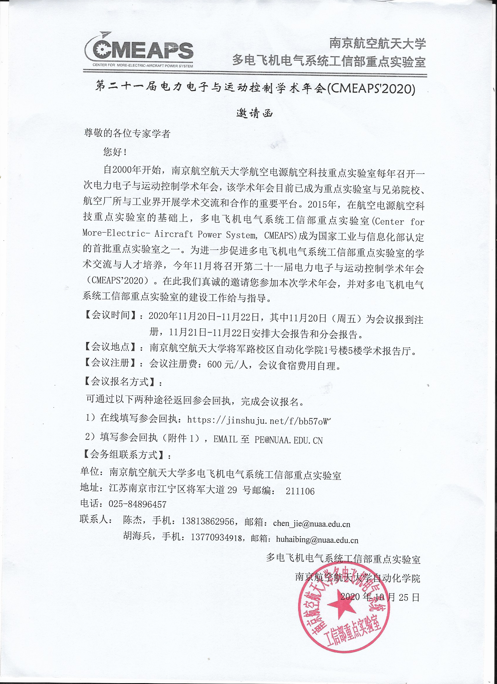 自2000年开始,番号 航空电源航空科技重点实验室每年召开一次电力电子与运动控制学术年会,该学术年会目前已成为重点实验室与兄弟院校、航空厂所与工业界开展学术交流和合作的重要平台。2015年,在航空电源航空科技重点实验室的基础上,多电飞机电气系统工信部重点实验室(Center for More-Electric- Aircraft Power System, CMEAPS)成为国家工业与信息化部认定的首批重点实验室之一。为进一步促进多电飞机电气系统工信部重点实验室的学术交流与人才培养,今年11月将召开第二十一届电力电子与运动控制学术年会(CMEAPS’2020)。在此我们真诚的邀请您参加本次学术年会,并对多电飞机电气系统工信部重点实验室的建设工作给与指导。