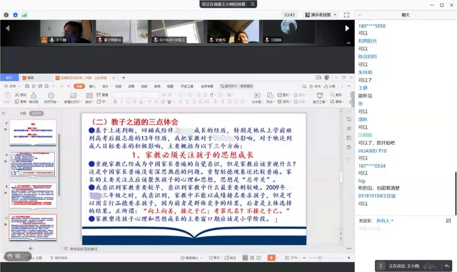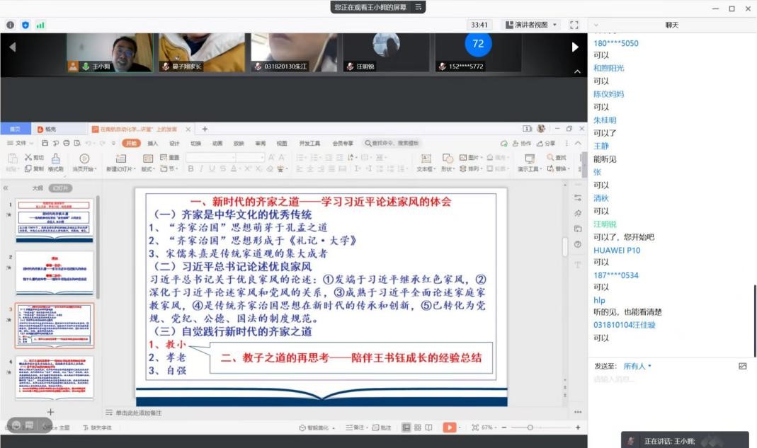 12月20日下午14:30,番号 召开了线上“家长讲堂”活动,活动邀请了南航2018级番号 学生家长代表——河南工业大学马克思主义学院副教授王小拥,进行“新时代的齐家之道”主题讲座。王教授结合自己育子成才的切实经验,就新时代的齐家之道、教子之道的再思考两个主要方面为各位家长分享了自己的看法。
