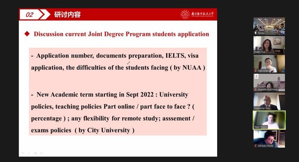 陆宁云简要介绍了学院学科专业、近五年国际合作成果、项目开展等基本情况。中英合作办学项目负责人张绍杰从项目历史沿革、年度运行和主要成果等方面详细介绍了与英国伦敦城市大学合作办学项目的开展情况。与会双方还就中外合作办学项目的运行细节、联合培养博士双学位协议、年度双边研讨会、国际合作联合实验室推进举措等方面进行了充分的讨论交流。