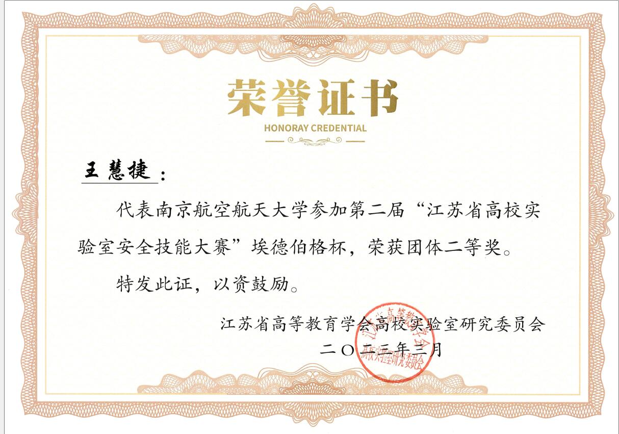 本次大赛分为实验室安全知识笔试和沉浸式隐患排查现场测试两部分,全省共有64所高校192名教师参赛。王慧捷积极备赛、认真参与,最终获得二等奖。