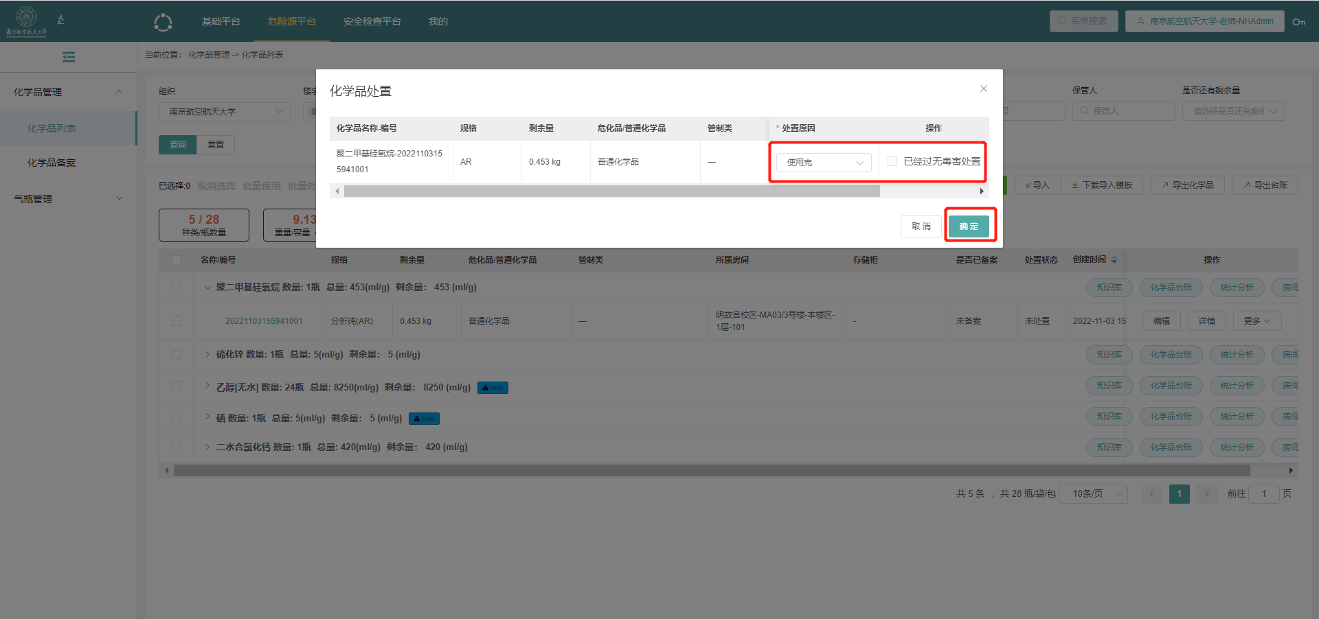 5.4如果系统单瓶剩余量比实际少,则点击化学品后,打开详情,将已有药品处置,并在处置后,重新点击新增化学品添加(先按照5.2操作,再按照5.1操作);