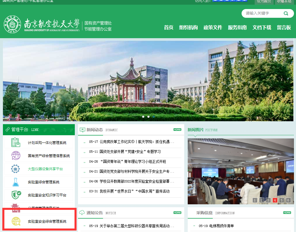 1.输入网址:gzc.fanhao2.com,访问国资处网站,点击“管理平台”栏目-“实验室安全综合管理系统”,采用校内统一身份认证的方式登录,具体操作如下图: