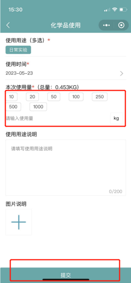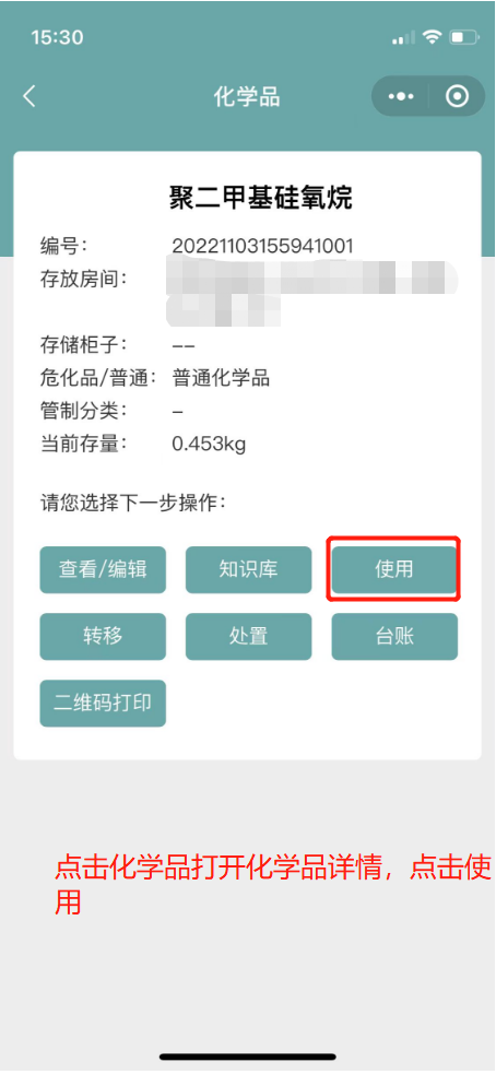 5.3如果系统单瓶剩余量比实际多,则点击化学品后,打开详情,点击使用,进行使用量登记;
