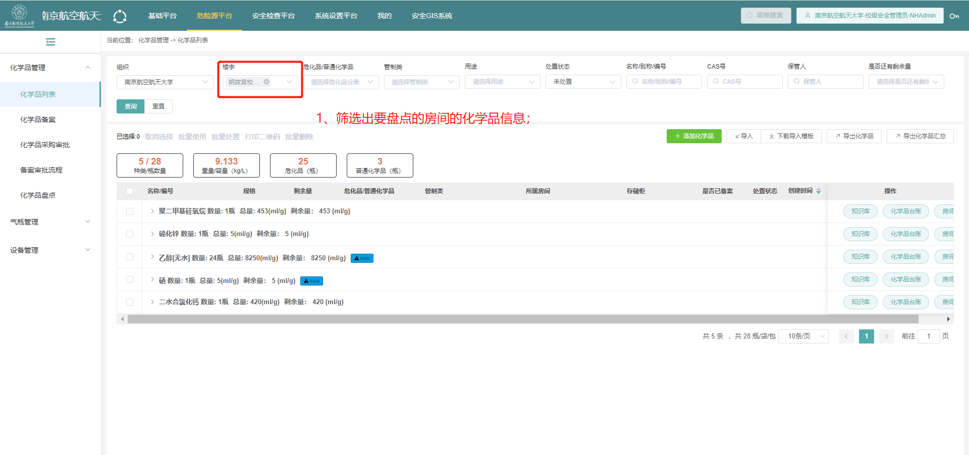 3.在化学品列表筛选出要盘存的房间的化学品信息;