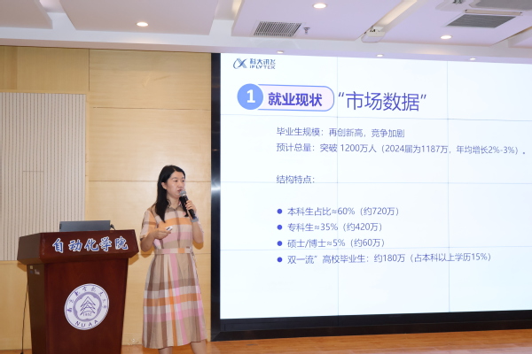 王秋楠以《来自企业视角的就业指导》为主题,围绕“就业准备”“简历设计”与“面试技巧”三大模块展开讲解。结合科大讯飞的校园招聘案例,深入分析了当前就业市场形势。她指出,2026届毕业生规模再创新高,各类学历层次毕业生的就业竞争将更为激烈,提醒同学们既要锚定职业方向,更需主动认清行业趋势与竞争环境,提前做好充分准备。