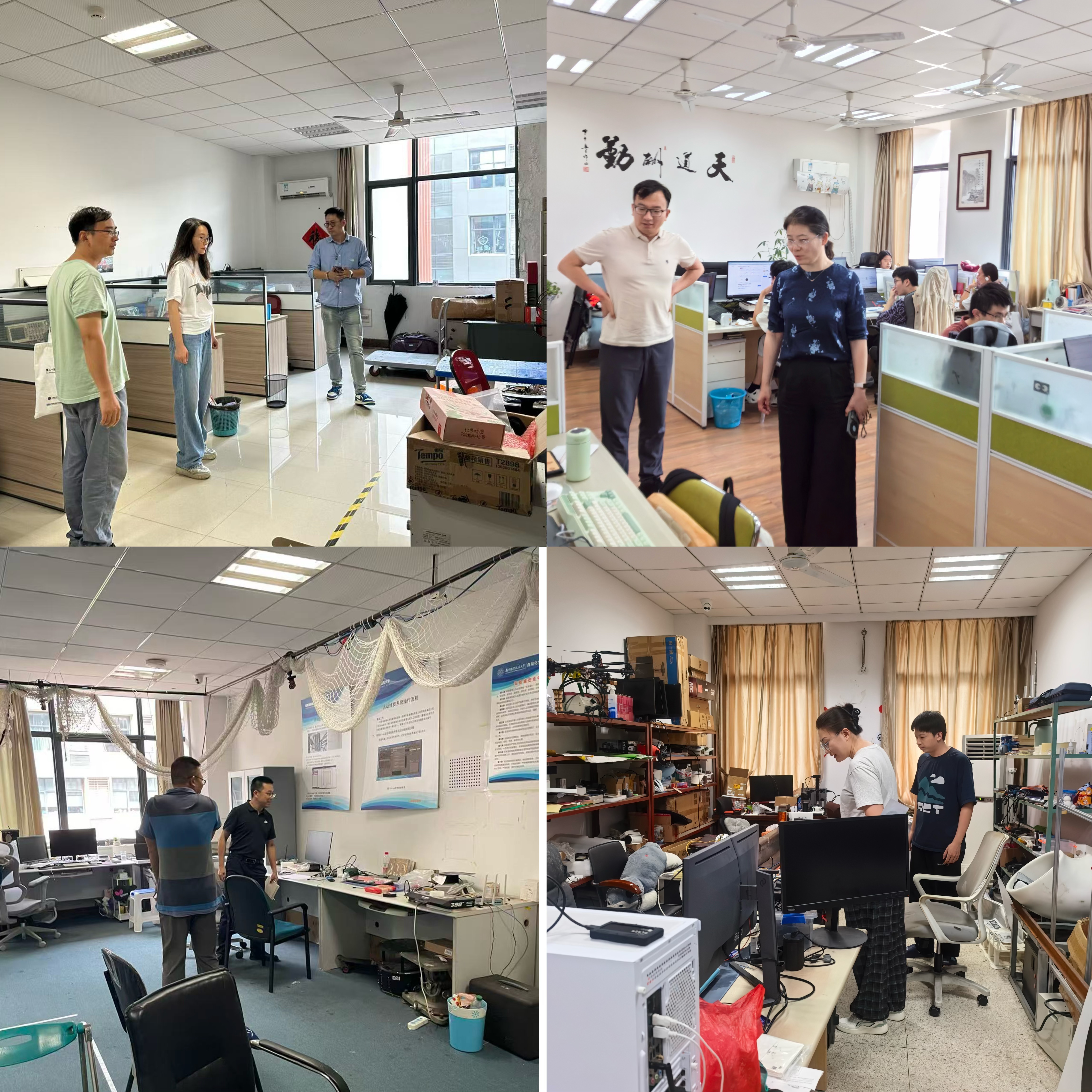 检查组一行深入走访了番号 楼全部重点实验室和学生工作室,检查范围覆盖用电安全、设备操作规范、消防设施配备、危险化学品管理、实验环境整洁度以及安全信息牌张贴情况等多个关键环节。