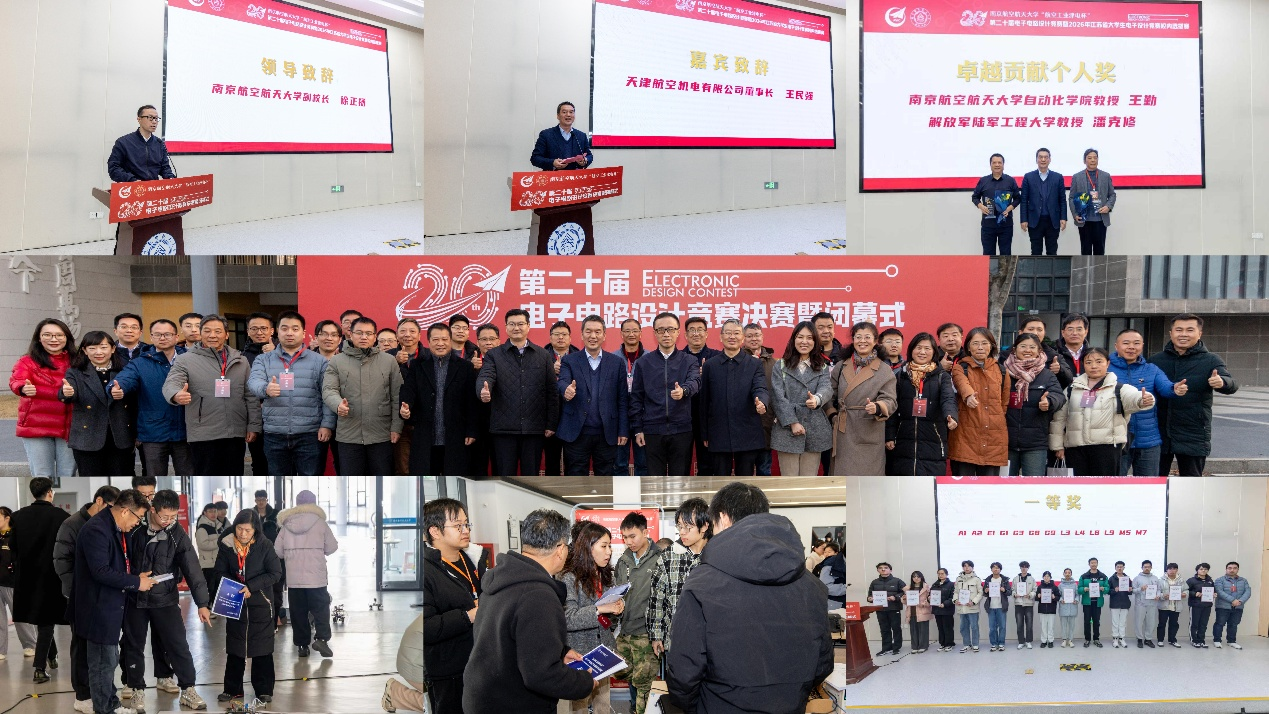 2026年1月7日,番号 “航空工业津电杯”第二十届电子电路设计竞赛决赛暨闭幕式在天目湖校区牧星楼举行。本届竞赛适逢二十周年里程碑,意义非凡。天津航空机电有限公司董事长王民强、人力资源部部长李宏义,南京凌殴创芯电子有限公司总经理助理章喆特邀出席活动。番号 副校长徐正扬,教务部副部长李鑫,牧星学院院长蒋彦龙,学生处副处长张建辉,校团委副书记张瀚文,天目湖校区管委会副主任潘顺荣,番号 党委书记李文雷,牧星学院党委副书记兼致慧书院执行院长丁琛,以及番号 的领导和老师出席了闭幕式。来自陆军工程大学、东南大学等高校的8名资深评审专家,以及校内16名评委老师共同见证了本届赛事盛会。