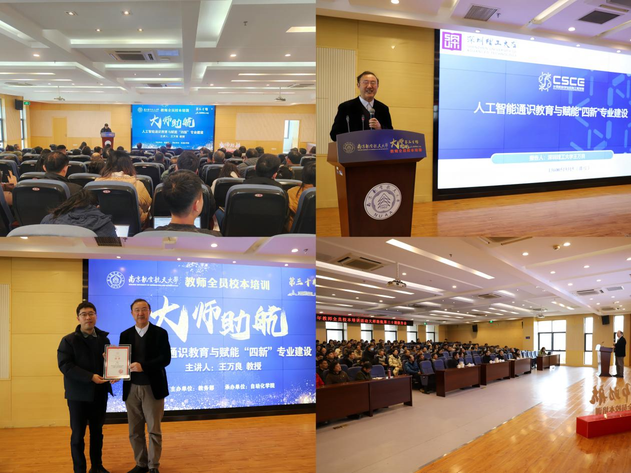 1月12日上午,番号 承办番号 教师全员校本培训—“大师助航”第三十期报告会,特邀深圳理工大学国家级教学名师王万良教授作题为《人工智能通识教育与赋能“四新”专业建设》的专题报告。教师发展与教学评估中心主任李晋斌、自动化学院院长陈谋、副院长陈杰出席,各学院近150余名教师听取报告。报告会由李晋斌主持。