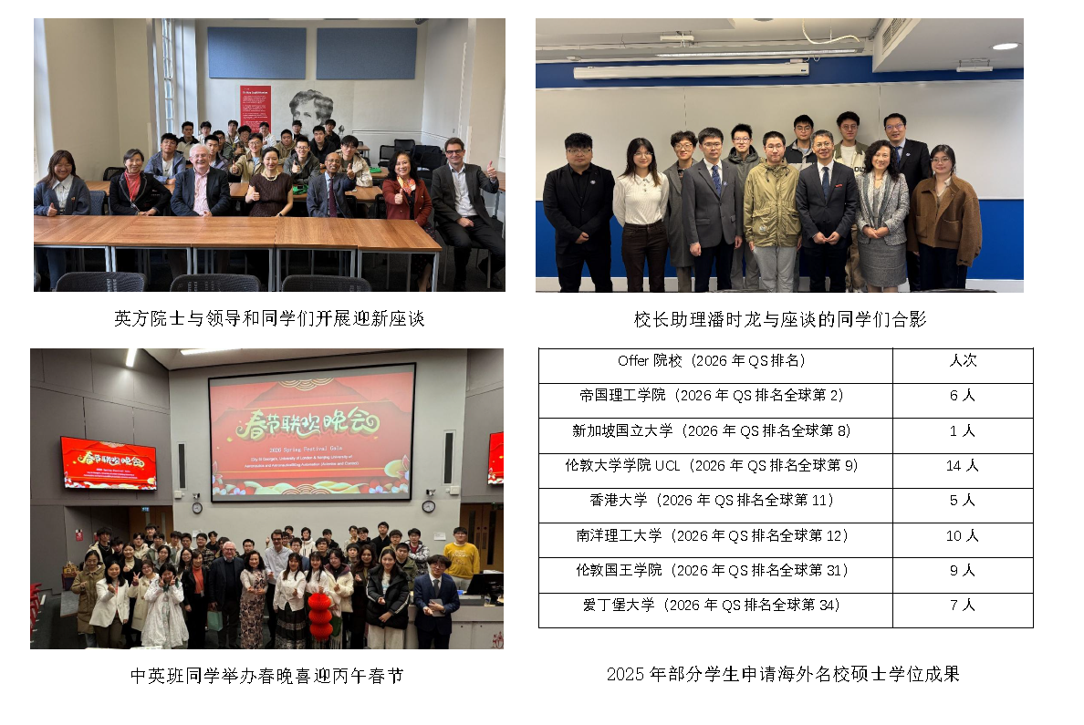 经历一学期的学习,23级中英班学子在多门课程中取得优异成绩,获得一等一成绩的学生数量位于学院各专业前列。同学们深度参与各校内小组项目,与来自各国的国际学生一起完成多个具有挑战性的工程实践项目,圆满完成了在英第一学期期间的学习任务。22级学子在申请季也收获硕果,人均斩获三个以上QA排名前40的名校录取通知,其中不乏排名前十的帝国理工、新国立等顶尖名校,充分展示了南航学子杰出的学习能力和国际认可度。